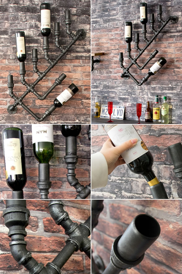 ヴィンテージ加工された目を引く配水管のデザインフレームに、ワインを逆さまに8本収納可能。
