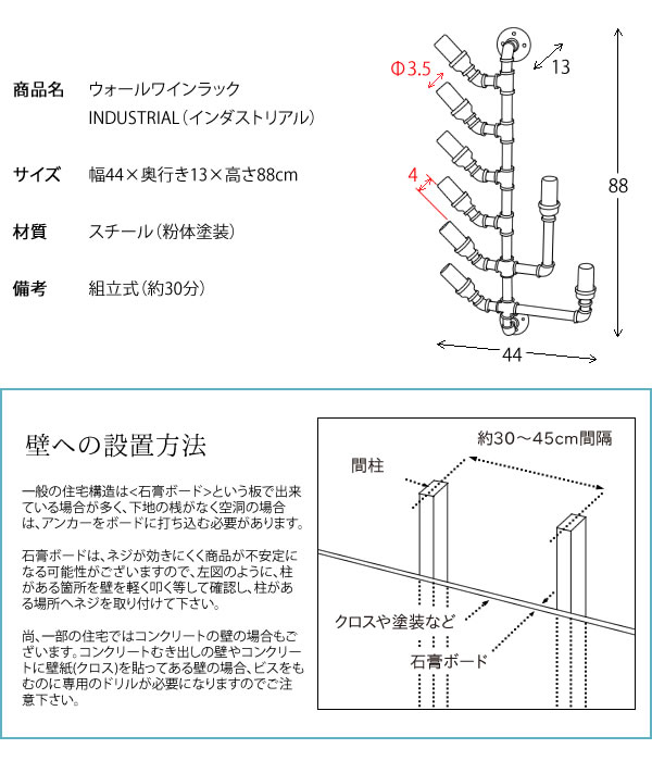 商品名ウォールワインラック INDUSTRIAL(インダストリアル) サイズ幅44×奥行き13×高さ88cm 材質スチール(粉体塗装) 備考組立式(約30分)
