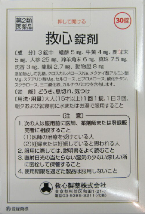 ○注意 1、次の人は服用前に医師または薬剤師に相談すること (1)医師の治療を受けている人 (2)妊婦または妊娠していると思われる人 2、服用に際しては、説明書をよく読むこと 3、直射日光の当たらない湿気の少ない涼しいところに密栓して保管すること 4、使用期限の過ぎた商品は服用しないこと 副作用救済制度のお問い合わせ先 (独)医薬品医療機器総合機構 電話 0120-149-931 医薬品区分:一般用医薬品 名称:精選生薬循環器用薬 内容量:錠剤 30錠 賞味期限:1年以上 製造販売者:救心製薬株式会社 東京都杉並区和田1-21-7 電話 03-5385-3211(代表) 問合せ先 電話 0120-935-810 (9時〜12時、13時〜17時 土日祝休日除く) 生産国:日本製 区分:第2類医薬品 広告文責:ゆうせい薬局 電話06-6472-0708<第2類医薬品>動悸、息切れ、気付けに