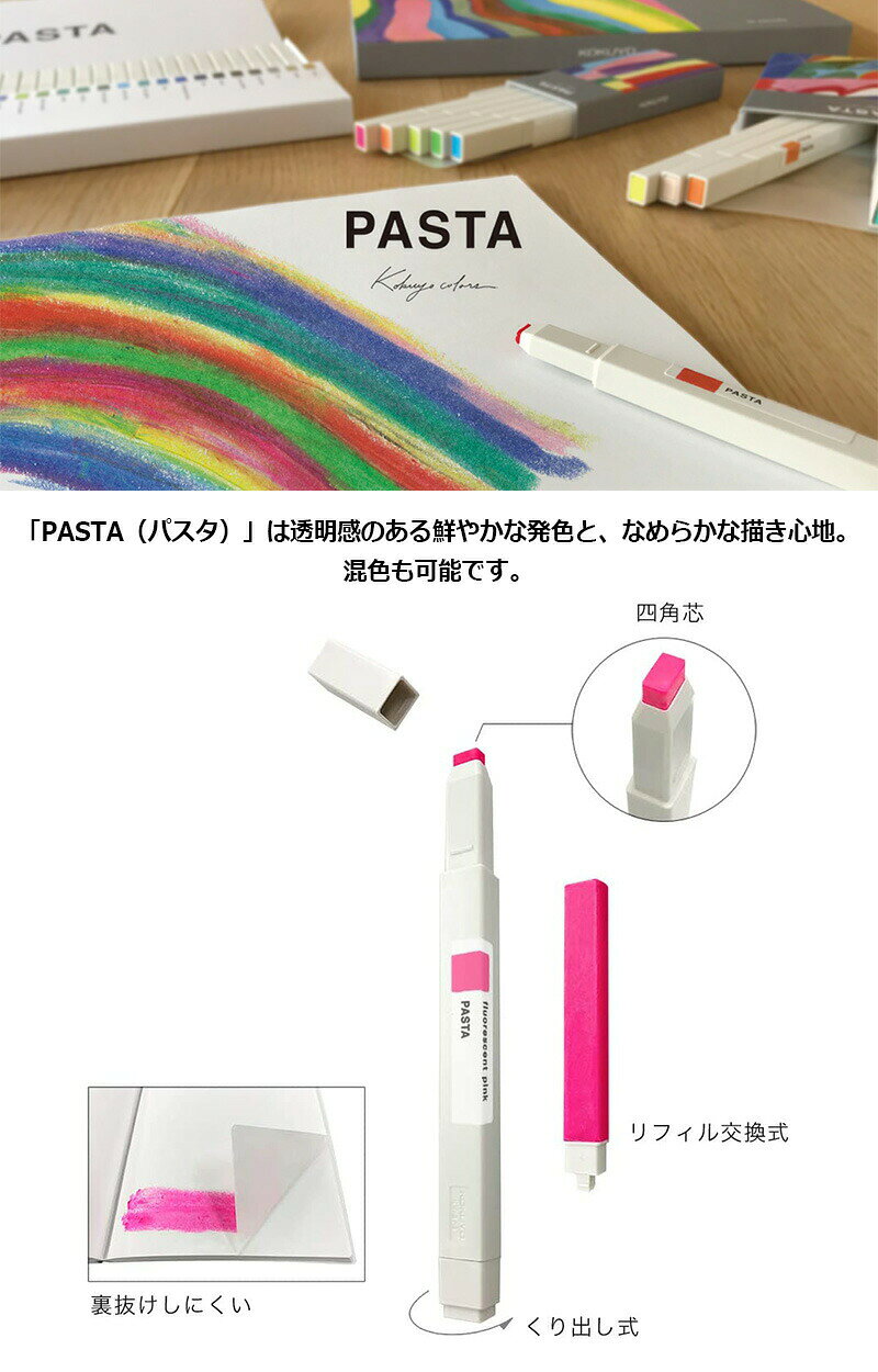 選べる5色セット【KOKUYO】コクヨ PASTA 固形グラフィックマーカー KE-SP15 特徴 ●「PASTA(パスタ)」は透明感のある鮮やかな発色と、なめらかな描き心地が特長の固形グラフィックマーカーです。