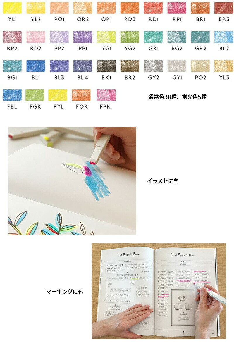 ●紙への裏抜けがしにくい色材や、細かい場所を塗りやすい四角芯、経済的なリフィル式を採用することで、描画材としても、ラインマーカーとしても、手頃で扱いやすい固形グラフィックマーカーです。