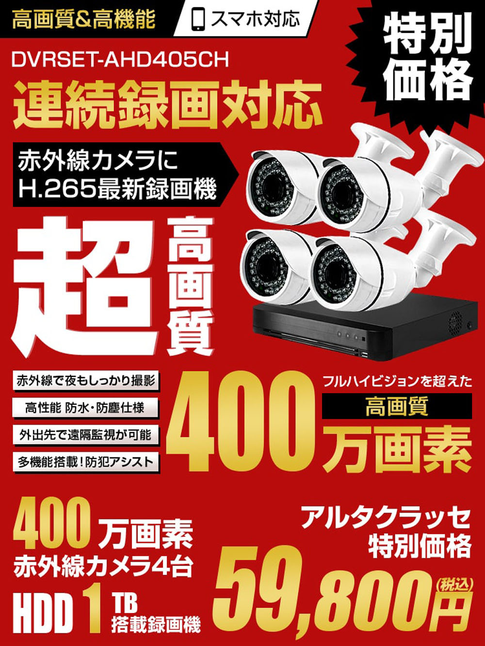 【送料無料】防犯カメラ 屋外 カメラ4台セット 400万画素 AHD HDD 1TB 防犯カメラセット 4MP 高画質 赤外線カメラ 防水 夜間撮影 3.6mm 広角撮影 家庭用 コンパクトカメラ レコーダー スマホ 遠隔監視 DVRSET-AHD405CH