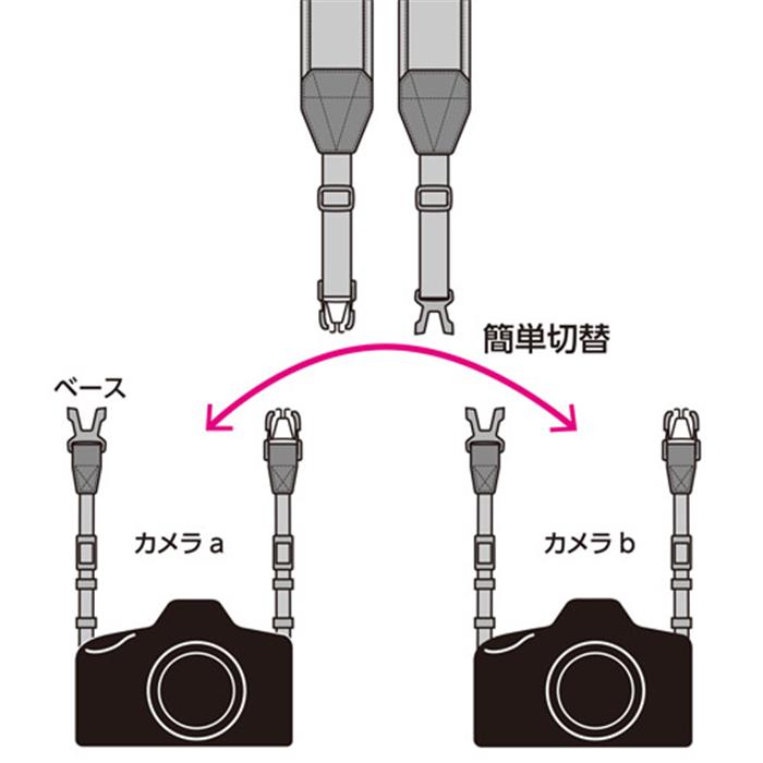 カメラ複数台で使いまわし可能複数台のカメラを持ち運ぶ際に、『ベース』を全てのカメラに装着しておけば、バックルの着脱で簡単にストラップを切り替えられるため、ショルダー部1本で使いまわしが可能になります。